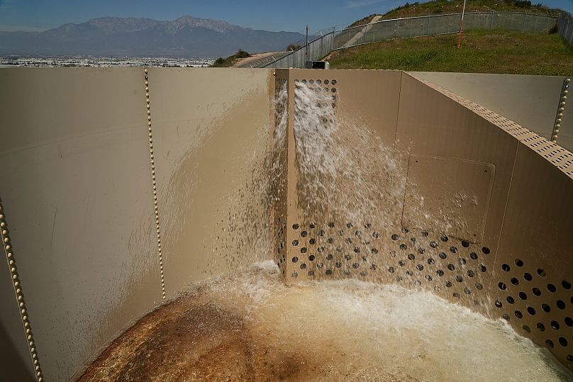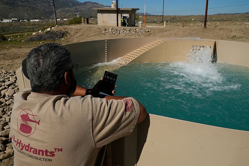 At a distant site in the southern Californian town of Cabazon, contractor Glenn Chavez was perched atop a ladder, looking inside an abandoned Heli-Hydrant. Holding a radio, he pressed a button to start the system, observing as water surged into the reservoir. Within approximately six minutes, it had accumulated 32,176 liters of water.